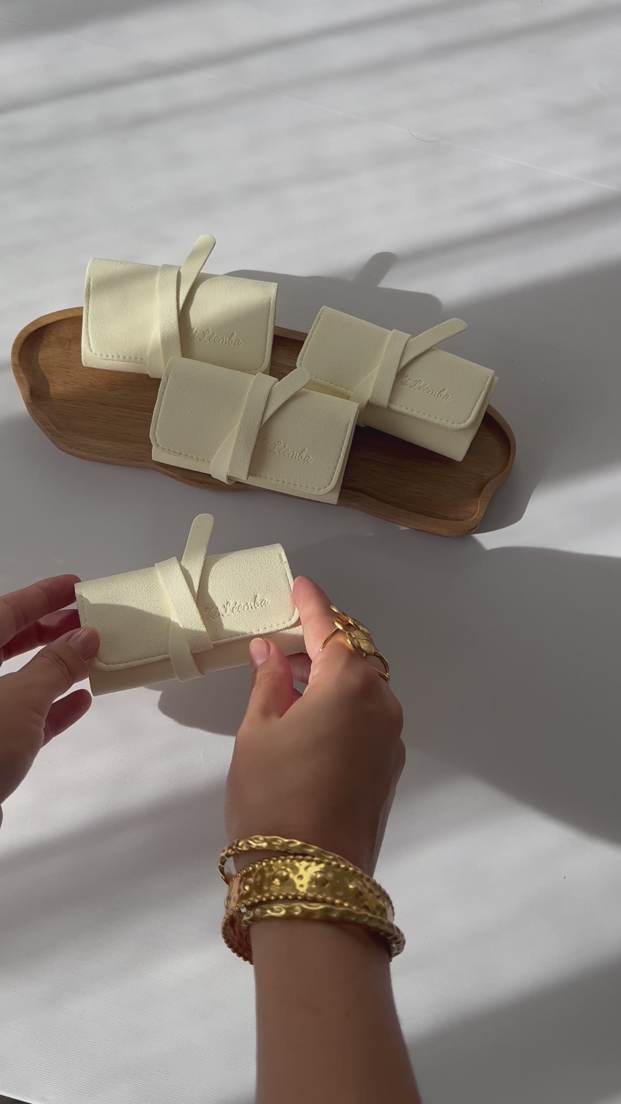 Lleva tus joyas siempre contigo con el joyero de viaje KI Léemba, un estuche elegante y compacto diseñado para proteger y organizar tus accesorios favoritos.